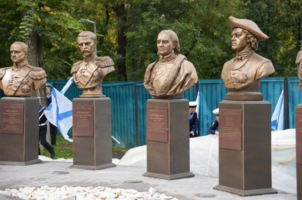 Спадает покрывало, и зрителям открываются бронзовые бюсты деятелей, принесших славу отечественному флоту. Они установлены на мраморных постаментах, к которым прикреплены памятные таблички с рассказом о заслугах и подвигах героев. В центре аллеи — бюст создателя Российского флота Петра Первого. Вслед за ним — его сподвижник Федор Апраксин, непобедимый адмирал Федор Ушаков и основатель флота на Черном море Григорий Потемкин. Рядом находятся скульптуры героев Севастопольской обороны Владимира Корнилова и Павла Нахимова. Здесь же — отлитые в металле образы героя русско-турецких войн Дмитрия Сенявина, одного из первооткрывателей Антарктиды Михаила Лазарева, пионера в использовании ледоходов Степана Макарова, героя Великой Отечественной войны Николая Кузнецова и организатора отечественного ракетно-ядерного флота Сергея Горшкова.
