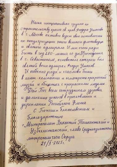 Особой нотой стало благословение Владыки. Он оставил тёплый отзыв в книге почётных гостей и пожелал музею дальнейших успехов в служении Родине и её морским традициям.