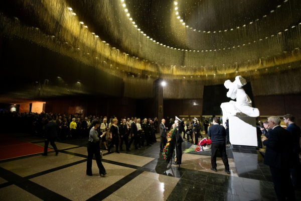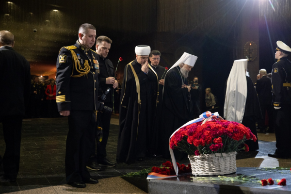 Затем в Зале Полководцев музея начался торжественный приём . После внесения Государственного флага России , памятного знамени Победы и Флага Военно-Морского флота был исполнен Государственный гимн РФ . С приветственным словом к собравшимся обратился заместитель Генерального директора музея вице-адмирал в отставке Смуглин Ф. С., который , кстати , в этот день был именинником . Перед участниками приёма выступили заместитель председателя Государственной думы России А. Н. Кузнецова и Постоянный член Священного Синода РПЦ , митрополит Ташкентский и Узбекистанский Викентий.
