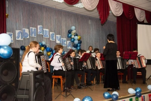 Первым на сцене был образцовый оркестр баянов «Гармония» Детской школы искусств им. П.И. Чайковского города Слободского с исполнением музыкальных произведений Михаила Глинки «Патриотическая песня» и «Славься».