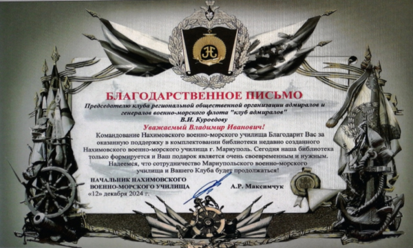 13.12.2024 г. Благодарственное письмо от Нахимовского военно-морского училища «Клубу адмиралов».