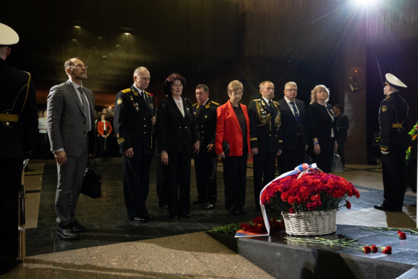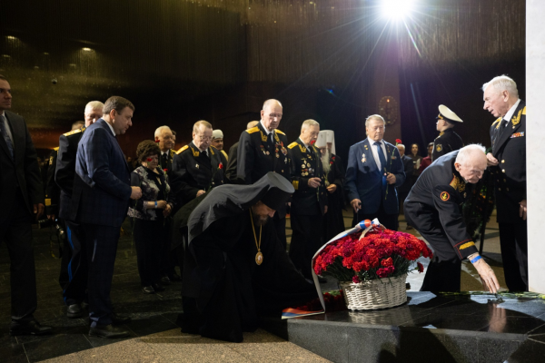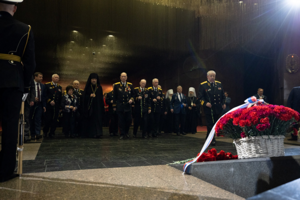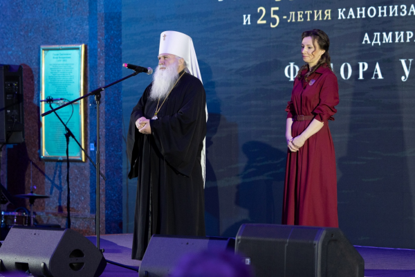 Затем в Зале Полководцев музея начался торжественный приём . После внесения Государственного флага России , памятного знамени Победы и Флага Военно-Морского флота был исполнен Государственный гимн РФ . С приветственным словом к собравшимся обратился заместитель Генерального директора музея вице-адмирал в отставке Смуглин Ф. С., который , кстати , в этот день был именинником . Перед участниками приёма выступили заместитель председателя Государственной думы России А. Н. Кузнецова и Постоянный член Священного Синода РПЦ , митрополит Ташкентский и Узбекистанский Викентий.