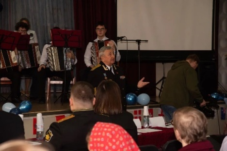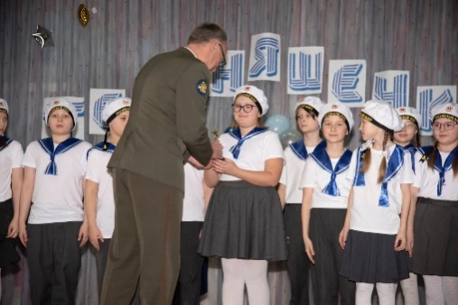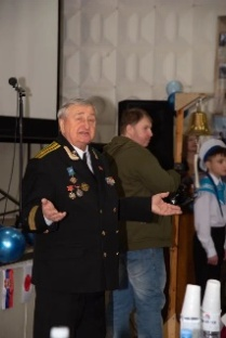 Затем ведущие предоставили слово авторам праздника, которому начало положено в 2022 году как Всероссийский военно-патриотический фестиваль, композитору Игорю Русских и председателю организации «Морские границы», капитану 3 ранга в отставке Юрию Малых. Они дуэтом исполнили написанную ими в 2021 году песню «Тельняшечка», ставшую названием торжественного мероприятия Российского масштаба.