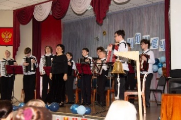 Первым на сцене был образцовый оркестр баянов «Гармония» Детской школы искусств им. П.И. Чайковского города Слободского с исполнением музыкальных произведений Михаила Глинки «Патриотическая песня» и «Славься».