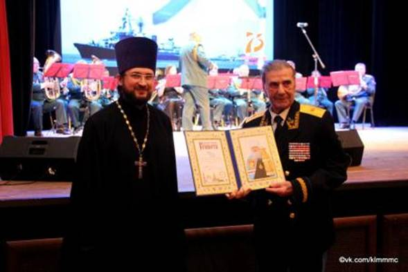 В ходе тематического вечера заместитель благочинного церквей Коломенского округа, настоятель Успенского кафедрального собора священник Илья Лукьянов выполнил почетную миссию – вручил благодарственное письмо митрополита Коломенского и Крутицкого Ювеналия заслуженному военному летчику СССР генерал-майору авиации, члену «Клуба адмиралов» Ивану Ивановичу Ивкину